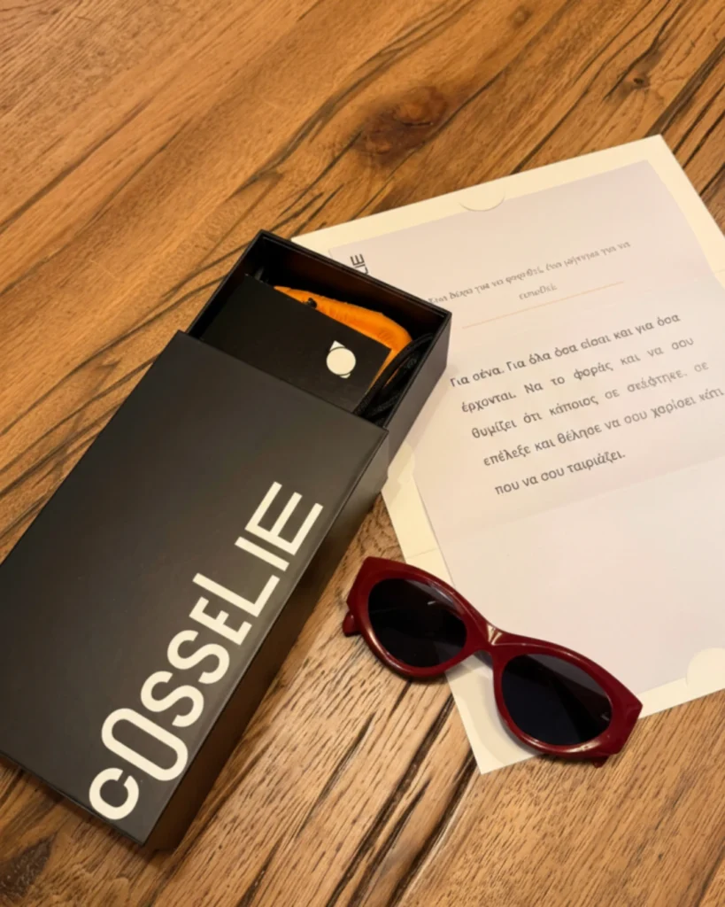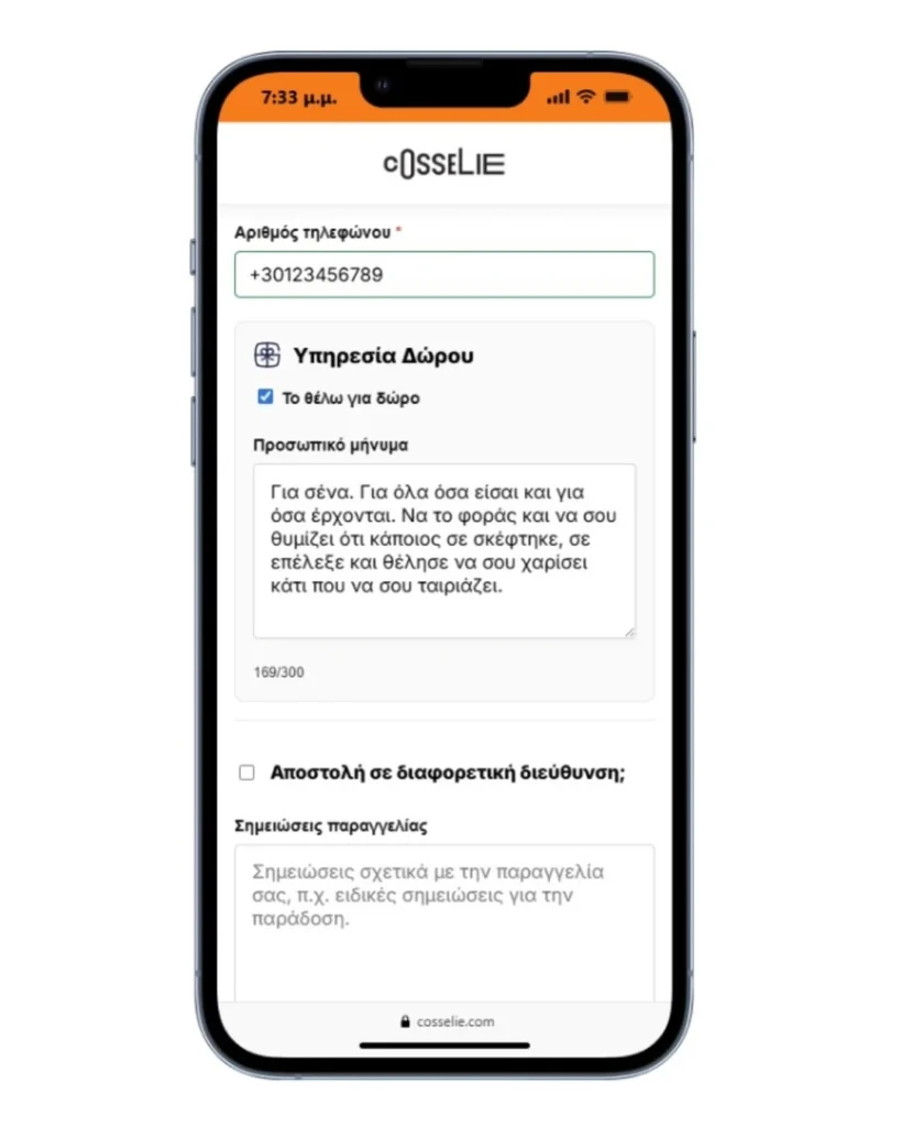 Στην COSSELIE πιστεύουμε ότι ένα δώρο δεν τελειώνει στο προϊόν. Τελειώνει στο συναίσθημα που δημιουργεί. Γι’ αυτό και δώσαμε στο καλάθι μας μια απλή αλλά ουσιαστική δυνατότητα: την Υπηρεσία Δώρου — με τα δικά σου λόγια.