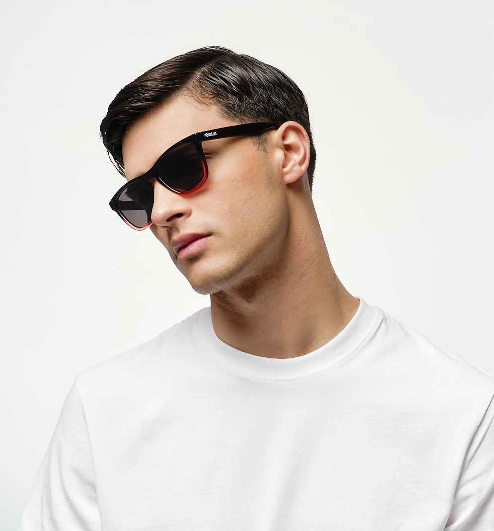 • Μαύροι συμπαγείς φακοί & μαύρο–κόκκινο fade που τραβά βλέμματα